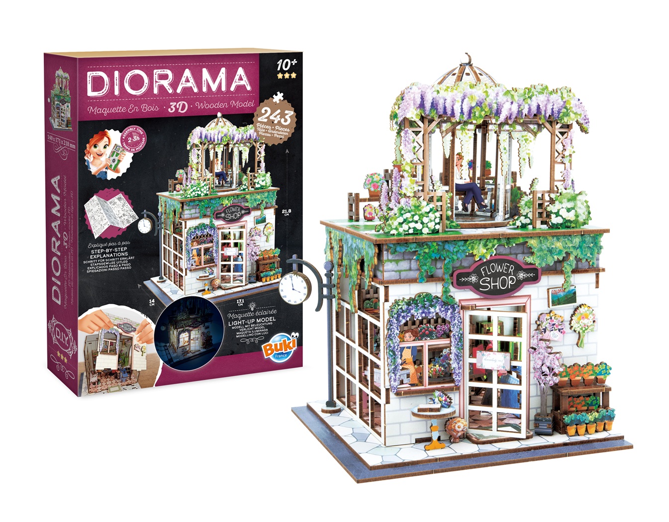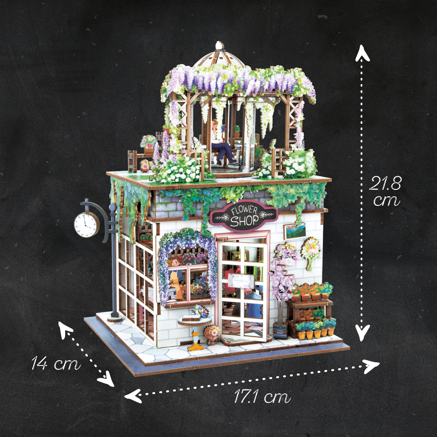 Ovaj set je prava poslastica za ljubitelje biljaka i minijatura, sa fokusom na prelepu terasu prekrivenu rascvetalom visterijom i šarmantnu prodavnicu u prizemlju.